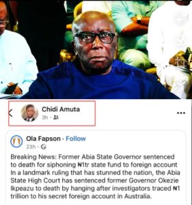 This, he shamelessly did when he shared on his Facebook ‘Chidi Amuta”a concocted piece of fake news against the 4th Governor of Abia State, Dr. Okezie Ikpeazu, a man far above his petty mischief.